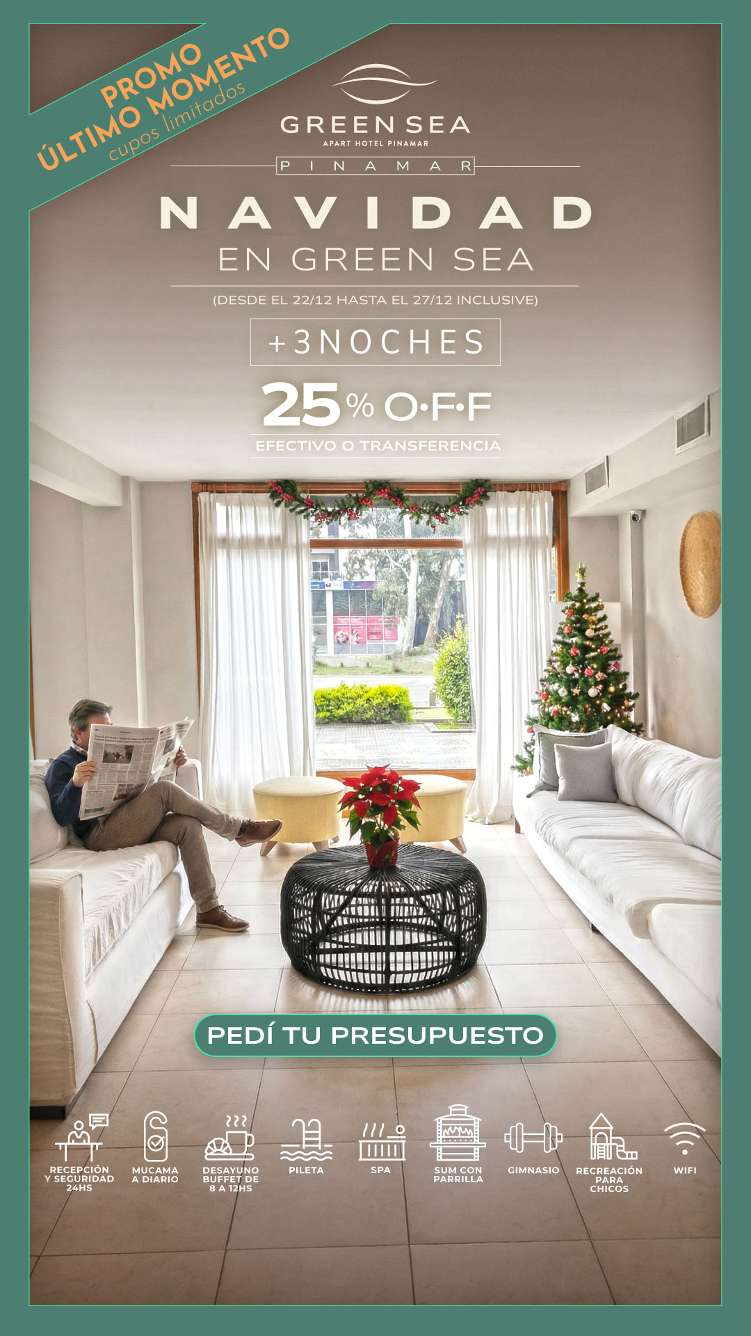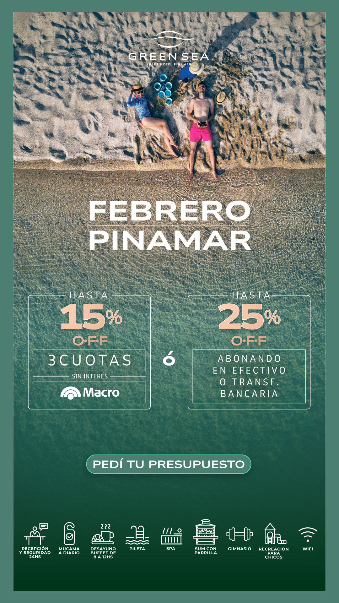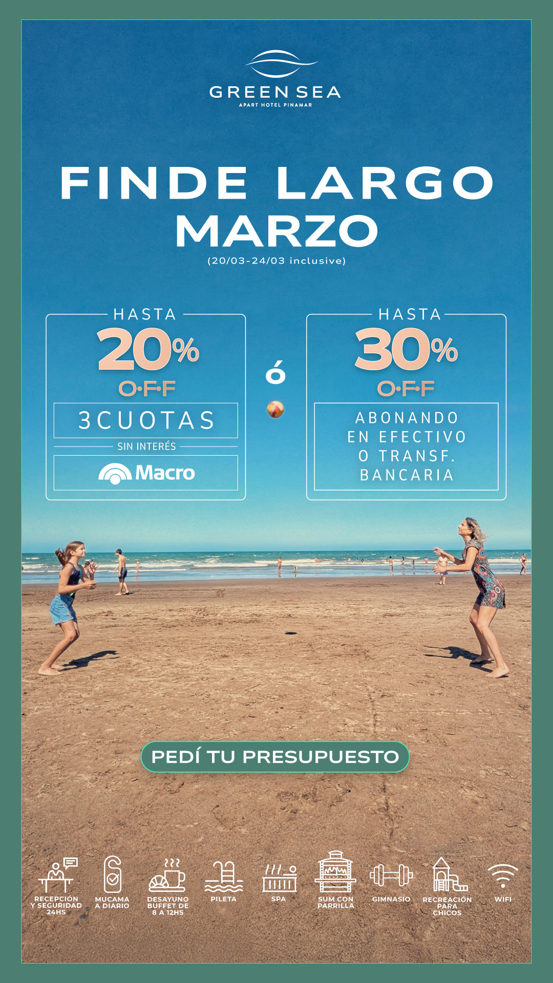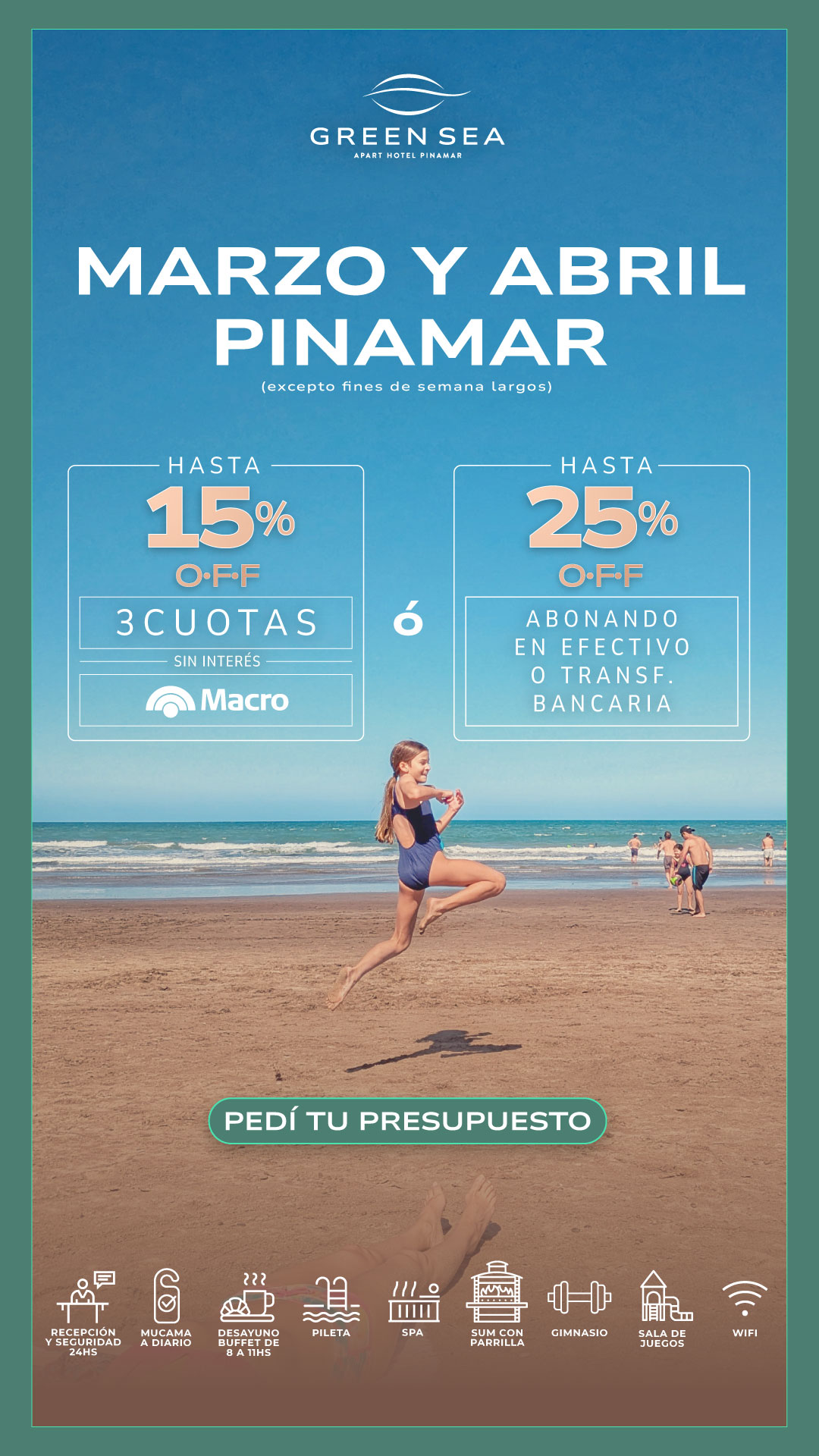 Nuestros exclusivos servicios hoteleros son imprescindibles para tus vacaciones perfectas. Todo el ano te ofrecemos recepcion 24 hs, servicio diario de mucama, desayuno buffet, gimnasio, pileta descubierta (verano) / pileta cubierta climatizada (excluviamente en otono e invierno), sala de juegos con mesa de ping pong, metegol, y juegos ludicos para los mas pequenos, servicio de recreacion para ninos a cargo de personal especializado (fines de semana largos, vacaciones de invierno y de verano), WIFI en todo el apart, sala de lectura y TV y mucho más.