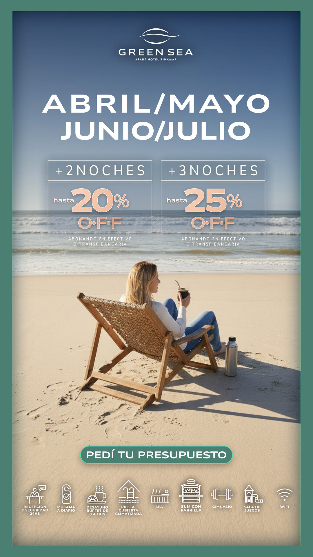 Nuestros exclusivos servicios hoteleros son imprescindibles para tus vacaciones perfectas. Todo el ano te ofrecemos recepcion 24 hs, servicio diario de mucama, desayuno buffet, gimnasio, pileta descubierta (verano)* / pileta cubierta climatizada (invierno)*, sala de juegos con mesa de ping pong, metegol, y juegos ludicos para los mas pequenos, servicio de recreacion para ninos a cargo de personal especializado (fines de semana largos, vacaciones de invierno y de verano), WIFI en todo el apart, sala de lectura y TV y mucho más.