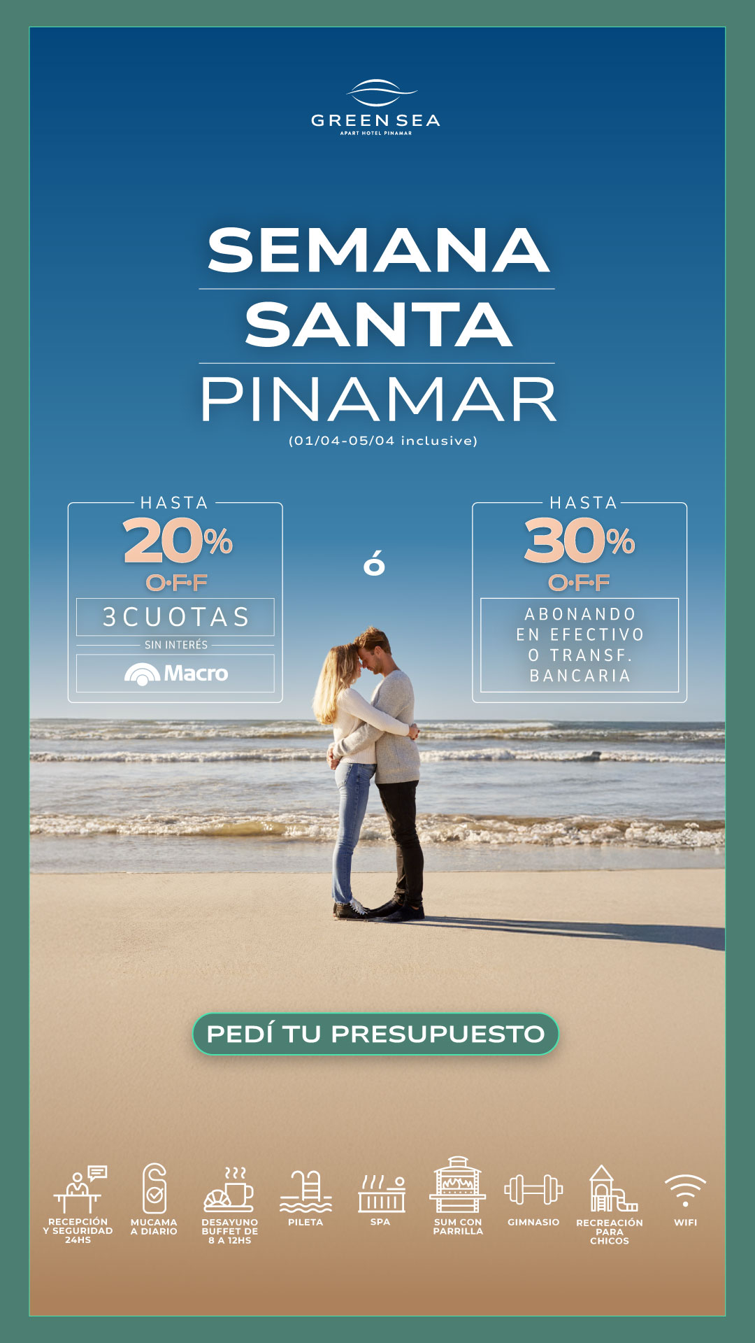 Nuestros exclusivos servicios hoteleros son imprescindibles para tus vacaciones perfectas. Todo el ano te ofrecemos recepcion 24 hs, servicio diario de mucama, desayuno buffet, gimnasio, pileta descubierta (verano) / pileta cubierta climatizada (excluviamente en otono e invierno), sala de juegos con mesa de ping pong, metegol, y juegos ludicos para los mas pequenos, servicio de recreacion para ninos a cargo de personal especializado (fines de semana largos, vacaciones de invierno y de verano), WIFI en todo el apart, sala de lectura y TV y mucho más.